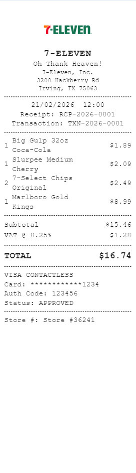 Preview our 7 Eleven receipt template below. This example shows the realistic layout and formatting you can expect. Every field is fully customizable — adjust items, prices, dates, and more to match your needs.