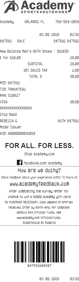 Preview our Academy Sports receipt template below. This example shows the realistic layout and formatting you can expect. Every field is fully customizable — adjust items, prices, dates, and more to match your needs.