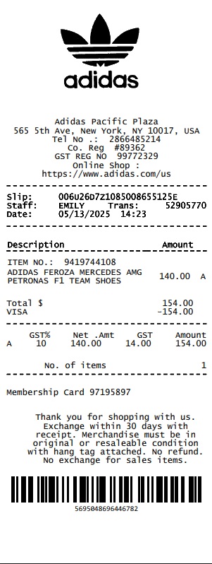 Preview our Adidas receipt template below. This example shows the realistic layout and formatting you can expect. Every field is fully customizable — adjust items, prices, dates, and more to match your needs.