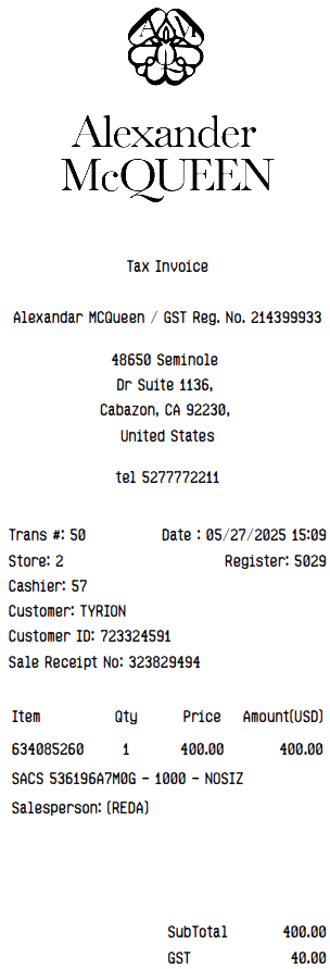 Preview our Alexander Mcqueen receipt template below. This example shows the realistic layout and formatting you can expect. Every field is fully customizable — adjust items, prices, dates, and more to match your needs.