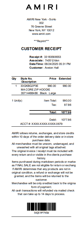 Preview our Amiri receipt template below. This example shows the realistic layout and formatting you can expect. Every field is fully customizable — adjust items, prices, dates, and more to match your needs.