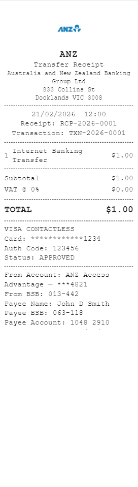 Preview our Anz Bank receipt template below. This example shows the realistic layout and formatting you can expect. Every field is fully customizable — adjust items, prices, dates, and more to match your needs.