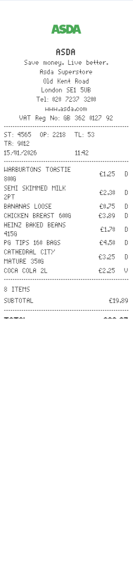 Preview our Asda receipt template below. This example shows the realistic layout and formatting you can expect. Every field is fully customizable — adjust items, prices, dates, and more to match your needs.