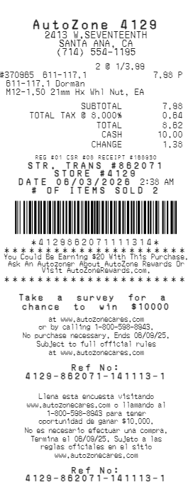 Preview our AutoZone receipt template below. This example shows the realistic layout and formatting you can expect. Every field is fully customizable — adjust items, prices, dates, and more to match your needs.