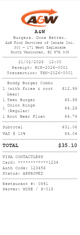 Preview our A&W Canada receipt template below. This example shows the realistic layout and formatting you can expect. Every field is fully customizable — adjust items, prices, dates, and more to match your needs.