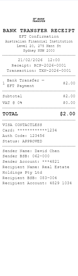 Preview our Bank Transfer Receipt Australia receipt template below. This example shows the realistic layout and formatting you can expect. Every field is fully customizable — adjust items, prices, dates, and more to match your needs.