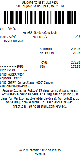 Preview our Best Buy receipt template below. This example shows the realistic layout and formatting you can expect. Every field is fully customizable — adjust items, prices, dates, and more to match your needs.