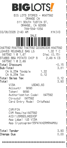 Preview our Biglots receipt template below. This example shows the realistic layout and formatting you can expect. Every field is fully customizable — adjust items, prices, dates, and more to match your needs.