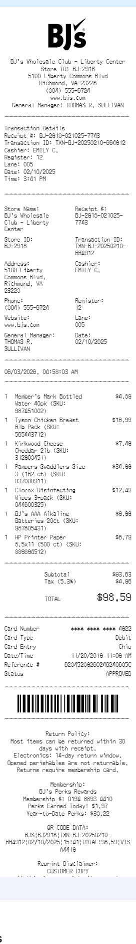 Preview our BJ's receipt template below. This example shows the realistic layout and formatting you can expect. Every field is fully customizable — adjust items, prices, dates, and more to match your needs.