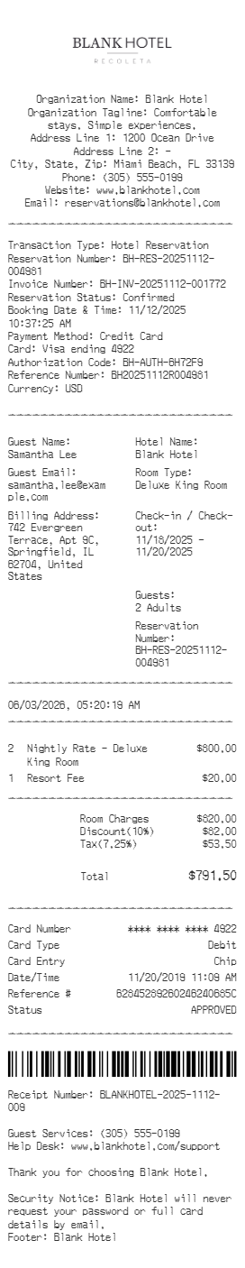 Preview our Blank Hotel receipt template below. This example shows the realistic layout and formatting you can expect. Every field is fully customizable — adjust items, prices, dates, and more to match your needs.