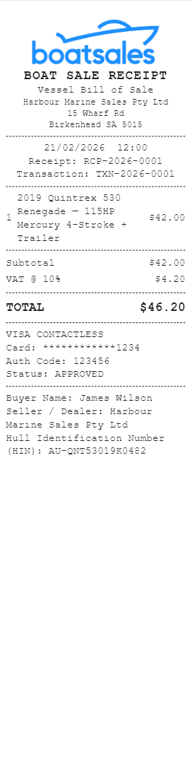 Preview our Boat Sale Receipt Australia receipt template below. This example shows the realistic layout and formatting you can expect. Every field is fully customizable — adjust items, prices, dates, and more to match your needs.