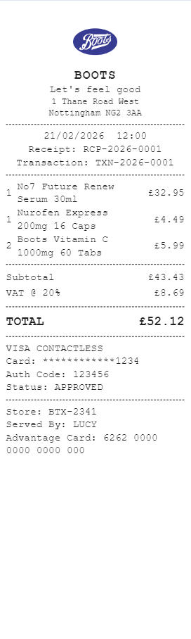 Preview our Boots receipt template below. This example shows the realistic layout and formatting you can expect. Every field is fully customizable — adjust items, prices, dates, and more to match your needs.