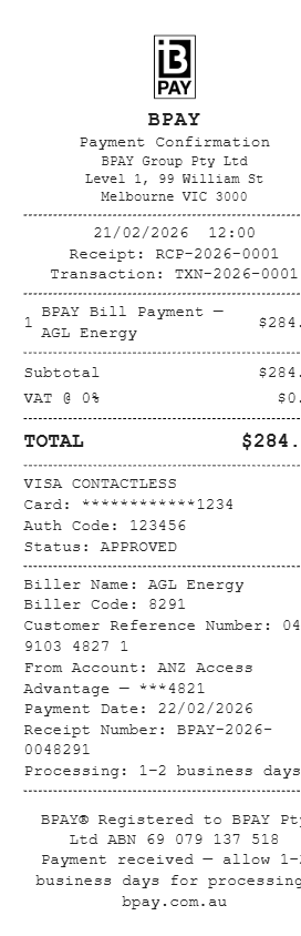 Preview our BPAY receipt template below. This example shows the realistic layout and formatting you can expect. Every field is fully customizable — adjust items, prices, dates, and more to match your needs.
