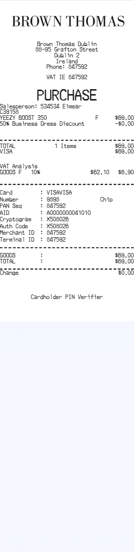 Preview our Brown Thomas receipt template below. This example shows the realistic layout and formatting you can expect. Every field is fully customizable — adjust items, prices, dates, and more to match your needs.