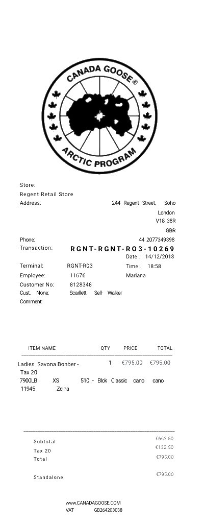 Preview our Canada Goose Sample receipt template below. This example shows the realistic layout and formatting you can expect. Every field is fully customizable — adjust items, prices, dates, and more to match your needs.