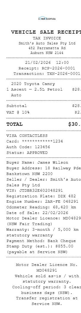 Preview our Car Sale Receipt Australia receipt template below. This example shows the realistic layout and formatting you can expect. Every field is fully customizable — adjust items, prices, dates, and more to match your needs.