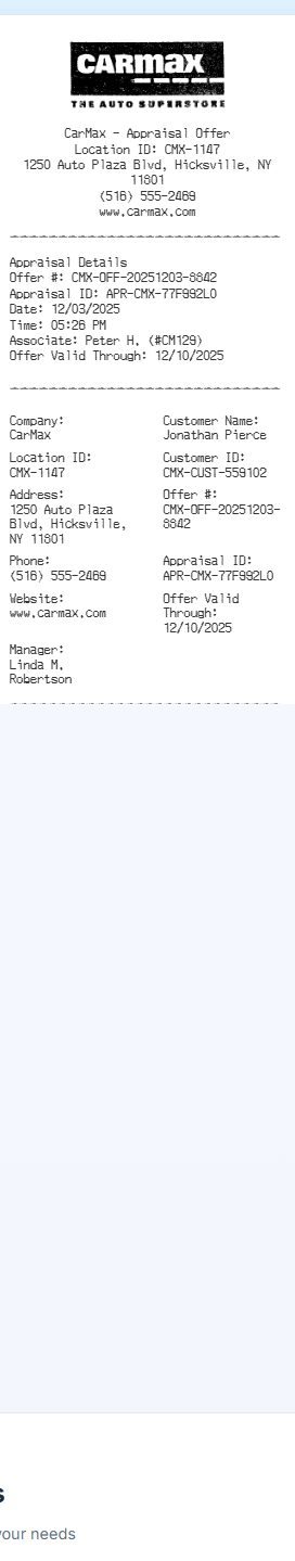 Preview our Carmax receipt template below. This example shows the realistic layout and formatting you can expect. Every field is fully customizable — adjust items, prices, dates, and more to match your needs.