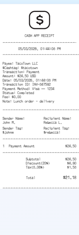 Preview our Cash App receipt template below. This example shows the realistic layout and formatting you can expect. Every field is fully customizable — adjust items, prices, dates, and more to match your needs.