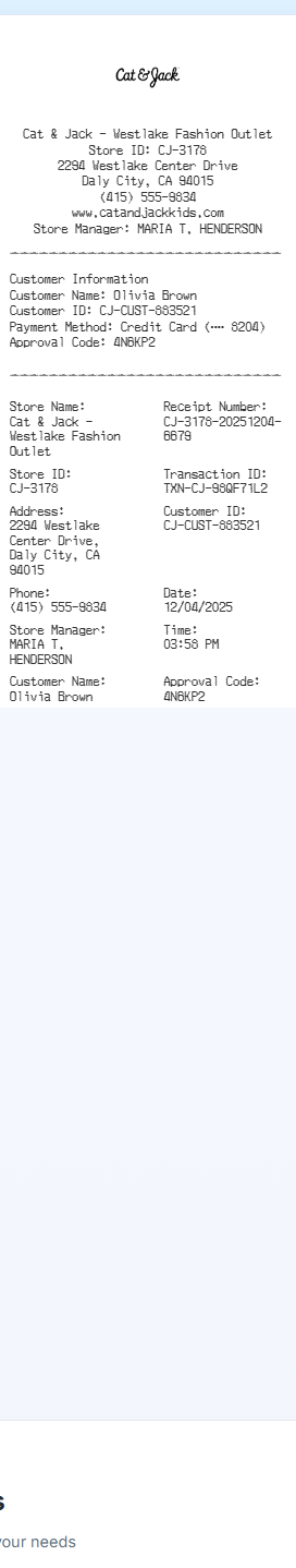 Preview our Cat Jack receipt template below. This example shows the realistic layout and formatting you can expect. Every field is fully customizable — adjust items, prices, dates, and more to match your needs.
