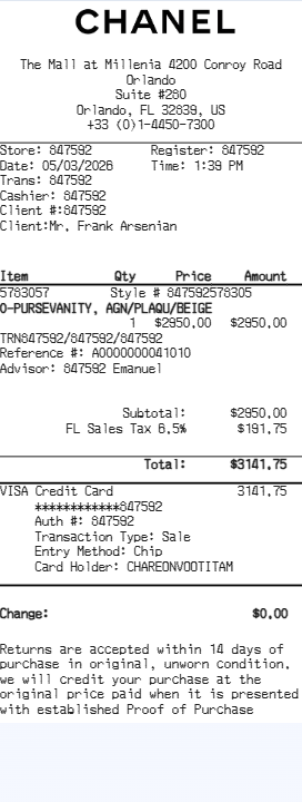 Preview our Chanel receipt template below. This example shows the realistic layout and formatting you can expect. Every field is fully customizable — adjust items, prices, dates, and more to match your needs.