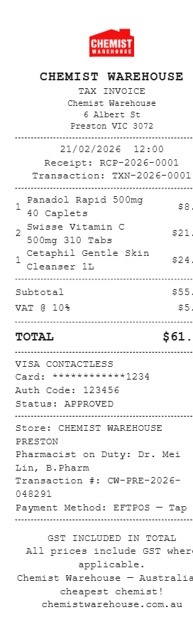 Preview our Chemist Warehouse receipt template below. This example shows the realistic layout and formatting you can expect. Every field is fully customizable — adjust items, prices, dates, and more to match your needs.