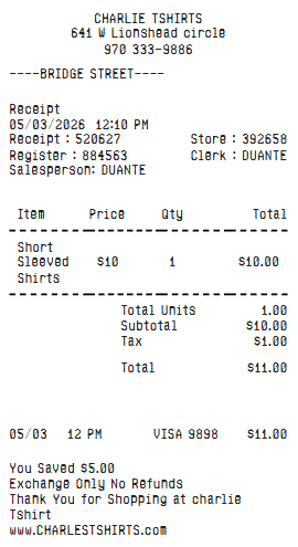 Preview our Clothing receipt template below. This example shows the realistic layout and formatting you can expect. Every field is fully customizable — adjust items, prices, dates, and more to match your needs.