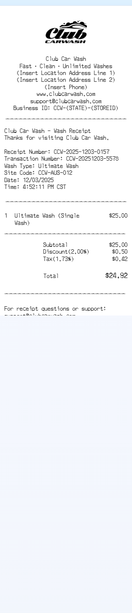 Preview our Club Car Wash receipt template below. This example shows the realistic layout and formatting you can expect. Every field is fully customizable — adjust items, prices, dates, and more to match your needs.