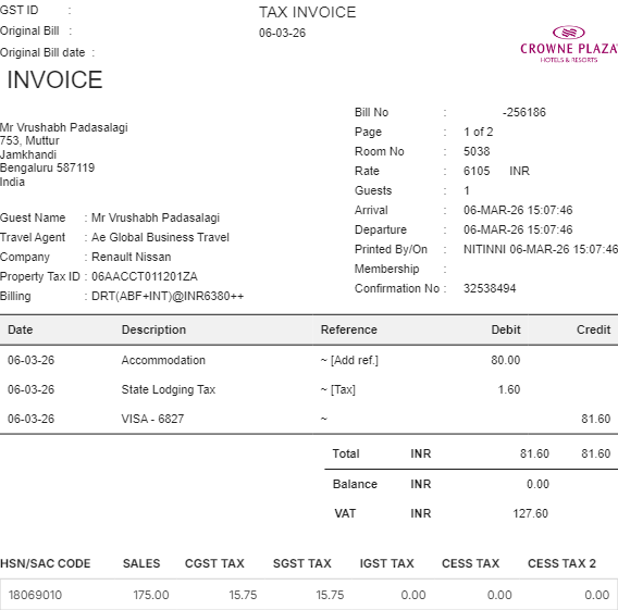 Preview our Crowne Plaza receipt template below. This example shows the realistic layout and formatting you can expect. Every field is fully customizable — adjust items, prices, dates, and more to match your needs.