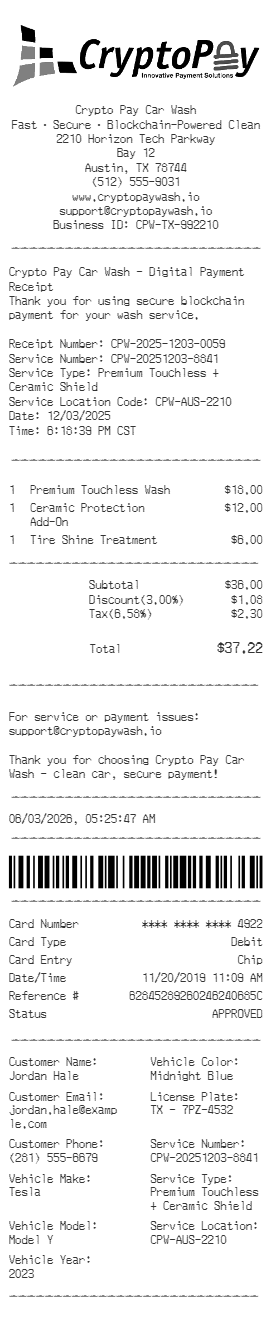 Preview our Cryptopay receipt template below. This example shows the realistic layout and formatting you can expect. Every field is fully customizable — adjust items, prices, dates, and more to match your needs.