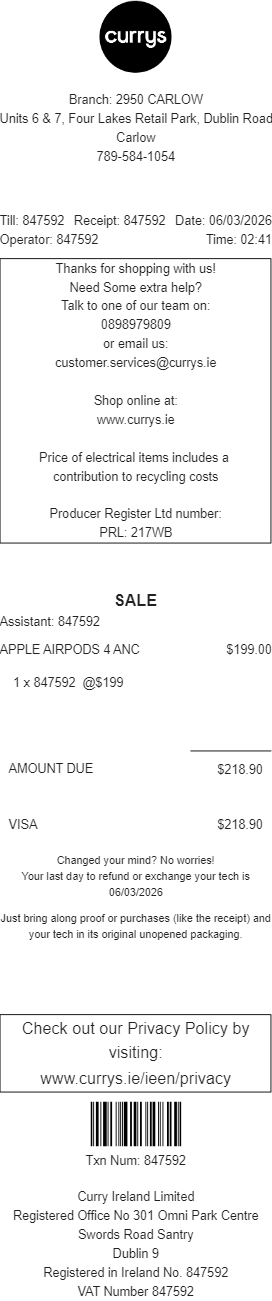 Preview our Currys receipt template below. This example shows the realistic layout and formatting you can expect. Every field is fully customizable — adjust items, prices, dates, and more to match your needs.