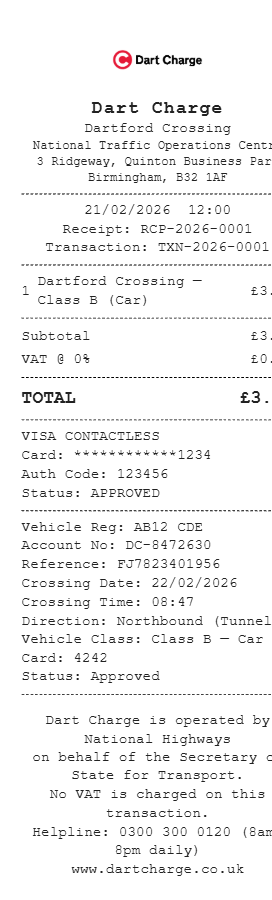Preview our Dart Charge receipt template below. This example shows the realistic layout and formatting you can expect. Every field is fully customizable — adjust items, prices, dates, and more to match your needs.