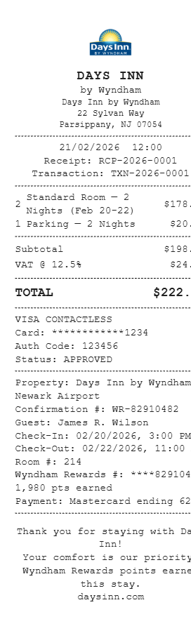 Preview our Days Inn receipt template below. This example shows the realistic layout and formatting you can expect. Every field is fully customizable — adjust items, prices, dates, and more to match your needs.