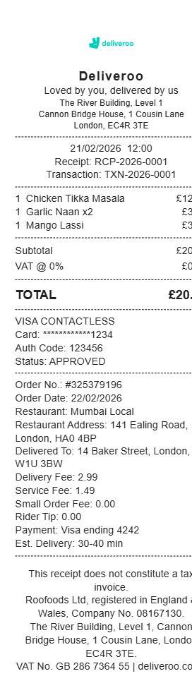 Preview our Deliveroo receipt template below. This example shows the realistic layout and formatting you can expect. Every field is fully customizable — adjust items, prices, dates, and more to match your needs.