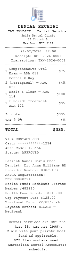 Preview our Dental Receipt Australia receipt template below. This example shows the realistic layout and formatting you can expect. Every field is fully customizable — adjust items, prices, dates, and more to match your needs.