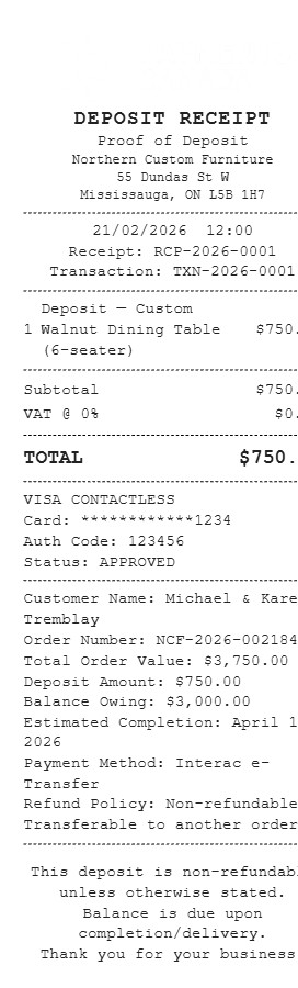 Preview our Deposit Receipt Canada receipt template below. This example shows the realistic layout and formatting you can expect. Every field is fully customizable — adjust items, prices, dates, and more to match your needs.
