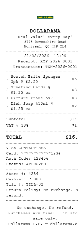 Preview our Dollarama Canada receipt template below. This example shows the realistic layout and formatting you can expect. Every field is fully customizable — adjust items, prices, dates, and more to match your needs.