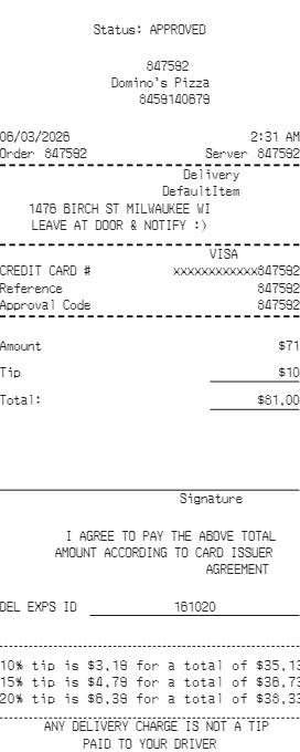 Preview our Domino's receipt template below. This example shows the realistic layout and formatting you can expect. Every field is fully customizable — adjust items, prices, dates, and more to match your needs.