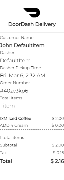 Preview our Doordash receipt template below. This example shows the realistic layout and formatting you can expect. Every field is fully customizable — adjust items, prices, dates, and more to match your needs.