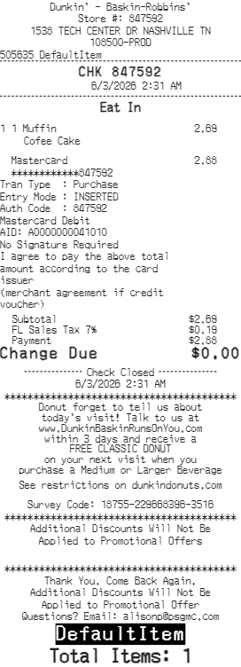 Preview our Dunkin' Donuts receipt template below. This example shows the realistic layout and formatting you can expect. Every field is fully customizable — adjust items, prices, dates, and more to match your needs.