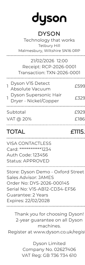 Preview our Dyson receipt template below. This example shows the realistic layout and formatting you can expect. Every field is fully customizable — adjust items, prices, dates, and more to match your needs.