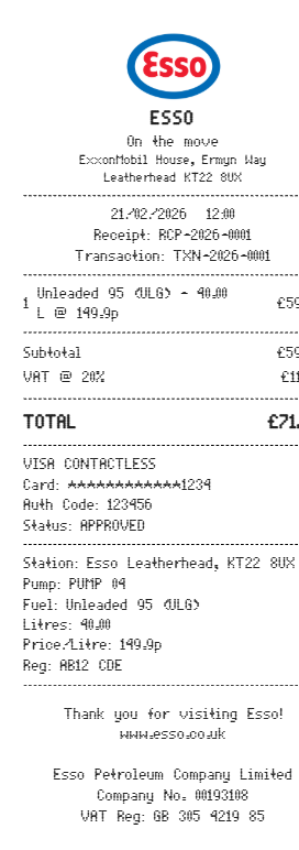Preview our Esso receipt template below. This example shows the realistic layout and formatting you can expect. Every field is fully customizable — adjust items, prices, dates, and more to match your needs.