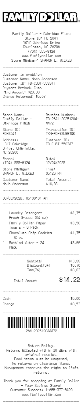 Preview our Family Dollar receipt template below. This example shows the realistic layout and formatting you can expect. Every field is fully customizable — adjust items, prices, dates, and more to match your needs.