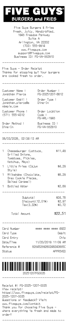 Preview our Five Guys receipt template below. This example shows the realistic layout and formatting you can expect. Every field is fully customizable — adjust items, prices, dates, and more to match your needs.