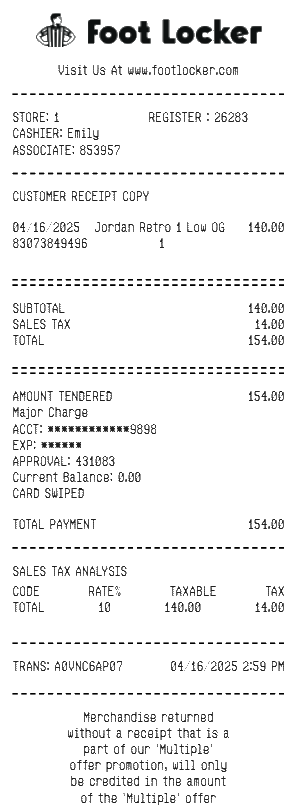 Preview our Foot Locker receipt template below. This example shows the realistic layout and formatting you can expect. Every field is fully customizable — adjust items, prices, dates, and more to match your needs.