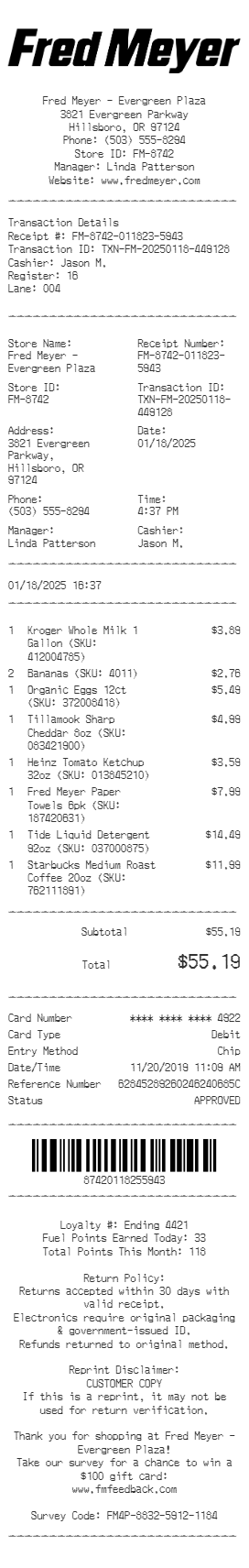 Preview our Fred Meyer receipt template below. This example shows the realistic layout and formatting you can expect. Every field is fully customizable — adjust items, prices, dates, and more to match your needs.