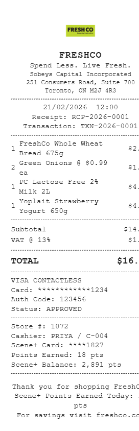 Preview our FreshCo Canada receipt template below. This example shows the realistic layout and formatting you can expect. Every field is fully customizable — adjust items, prices, dates, and more to match your needs.