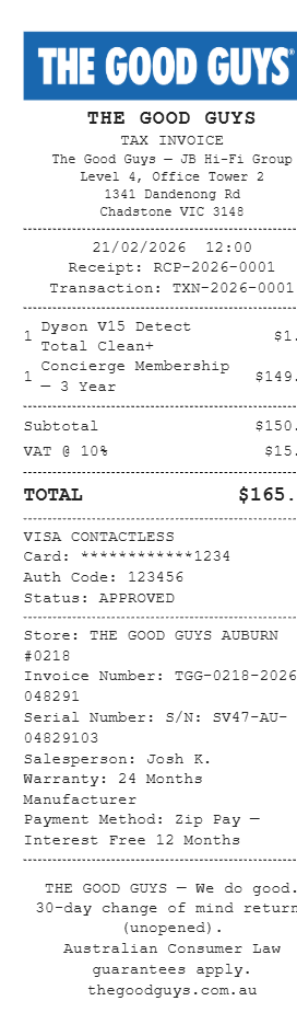 Preview our Good Guys receipt template below. This example shows the realistic layout and formatting you can expect. Every field is fully customizable — adjust items, prices, dates, and more to match your needs.