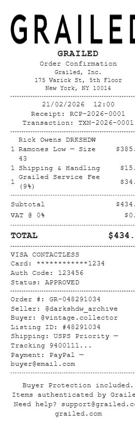 Preview our Grailed receipt template below. This example shows the realistic layout and formatting you can expect. Every field is fully customizable — adjust items, prices, dates, and more to match your needs.