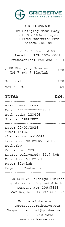 Preview our Gridserve receipt template below. This example shows the realistic layout and formatting you can expect. Every field is fully customizable — adjust items, prices, dates, and more to match your needs.