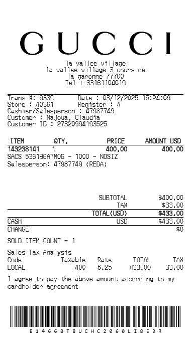 Preview our Gucci receipt template below. This example shows the realistic layout and formatting you can expect. Every field is fully customizable — adjust items, prices, dates, and more to match your needs.